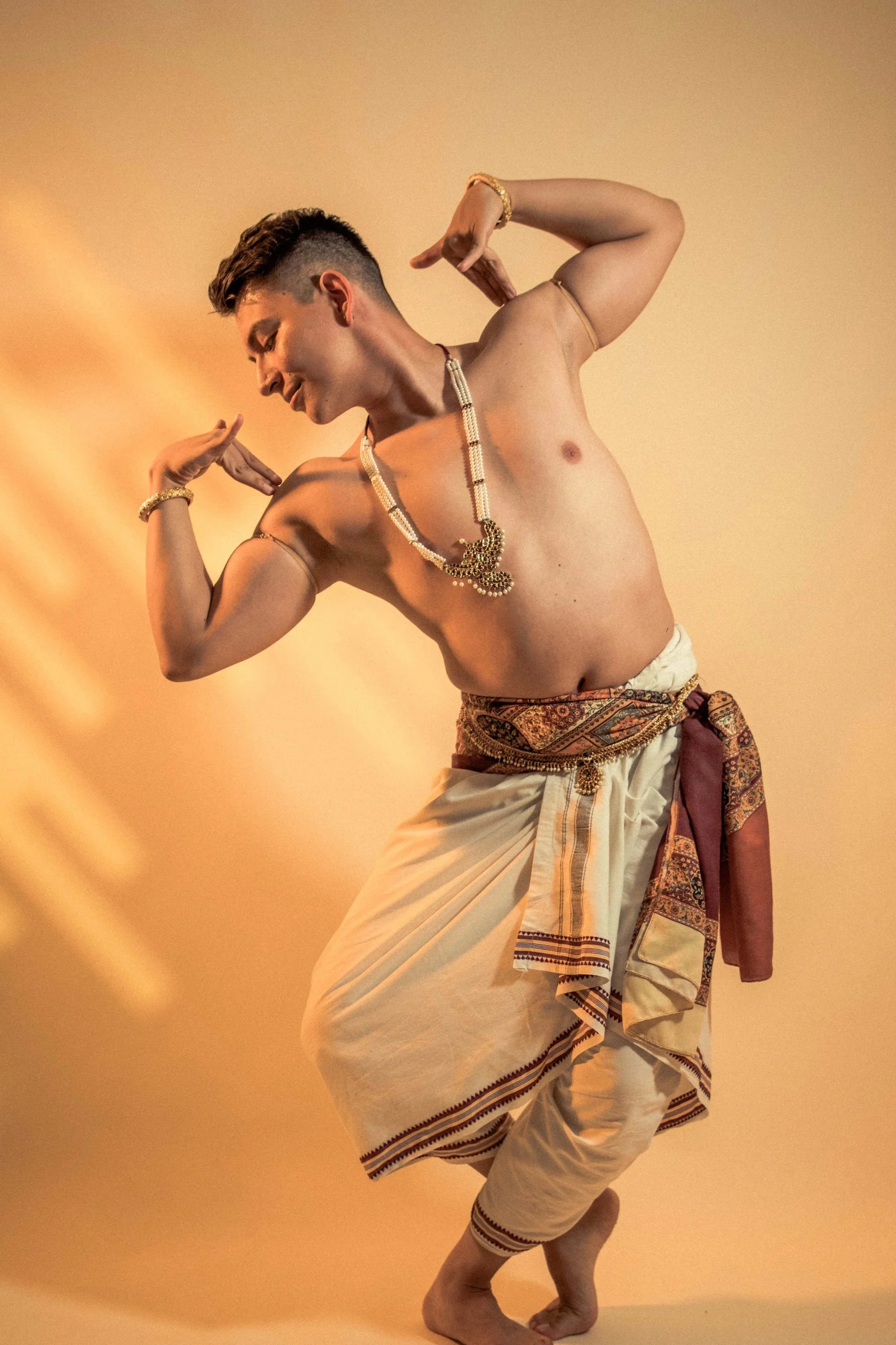 He began studying Indian performing arts in 2015 through Bharatanatyam and Mohiniyattam courses at the Gurudev Tagore Indian Cultural Center. In 2018, upon discovering his interest in Kuchipudi, he began formal training under Yamini Saripalli and Kasi Aysola, initially online and through frequent travel to the United States. He currently continues his studies as a disciple of Smt. Kalpana Sreenivas Jayanti.